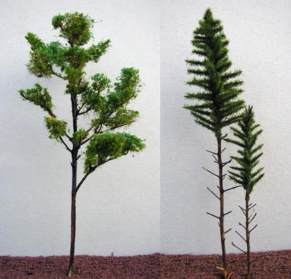 Grundlegend ein paar Gedanken zur Größe. Oftmals werden nur Musterexemplare von Bäumen mit maximaler Höhe nachgestaltet. In der Natur finden sich aber gerade an Bahndämmen Büsche und Bäume mit Höhen zwischen 5 und 15 m. Das sind in 1:220 umgerechnet 2,3 bis 6,8 cm! Und dann sind das Bäume, die meist eng beieinander stehen, oft nur auf einer Seite des Stammes Äste aufweisen und ineinander gewachsen sind. Auch die Stammdurchmesser, in der Natur oft 10 bis 30 cm, ergeben in Z nur 0,5 bis 1,4 mm.