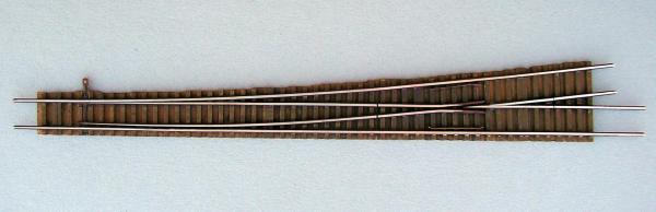 Die Zungenschienen sind über die Lötplättchen der Schwellen elektrisch mit dem Hauptgleis verbunden. Dadurch ist stets eine sichere Stromversorgung aller Weichenteile gegeben und selbst kleine Loks fahren problemlos darüber.