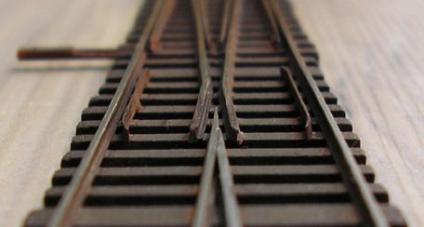 sind in Ihrem Aufbau wesentlich komlipizierter. Bei einer vorbildgerechten Umsetzung im Maßstab 1:220 erreicht man fast schon die Grenze des Machbaren, weil durch die Breite der Schienenprofile die Platzverhältnisse eingeschränkt sind. Man ist hier gezwungen, durch einen etwas größeren Radius der äußeren Backenschienen im "Inneren" der Weiche einige Zehntel Raum zu gewinnen. Dadurch kann man dann gerade so die Spurrillenmaße einhalten. Die mittigen Radlenker einzubauen ist auf Grund der Platzverhältnisse fast unmöglich. außerdem stellen sie dann möglicherweise eine Störquelle dar, so daß ich darauf verzichtet habe.