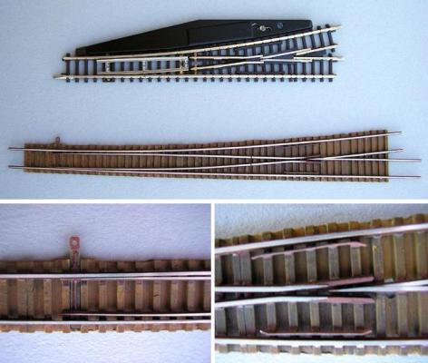 - vorbildähnliche Stellstange zwischen den Weichenzungen, der Antrieb erfolgt durch eine tiefer liegende Stellschwelle und seitlich wie beim Vorbild.