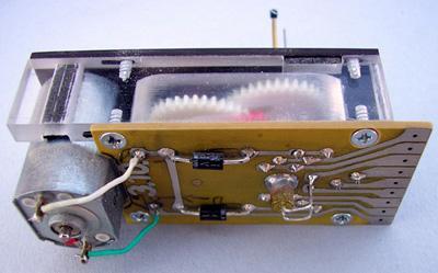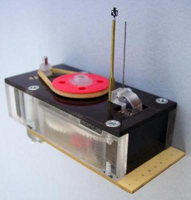 So entstand nach vielem Tüfteln ein Getriebe aus Conrad-Zahnrädern, dessen senkrechte Ausgangs-Hohlwelle eine 90° Drehung ausführt. Diese bewegt über einen Exzenter einen waagerechten Schieber, an dem der Weichenstelldraht angeschraubt ist. Das Ganze wird von einem Mabuchi-Motor über einen kleinen Riementrieb angetrieben, was die Geräusche auf ein Minimum reduziert. Die Kontakte für Endabschaltung, Polarisation und Rückmeldung schaltet das Zahnsegment auf der Abtriebswelle. Der Motor wird mit Gleichstrom betrieben, damit läuft er sicher an und dreht sehr leise. Außerdem kann man über die Spannung die Stellgeschwindigkeit optimieren. Das Stellen der Weiche erfolgt durch Umpolen der Gleichspannung, wodurch der Motor seine Drehrichtung ändert. Angesteuert wird er über einen 4-poligen Kippschalter. Es geht sicher auch „elektronischer", wer dazu eine Idee hat kann mir das gern mitteilen.
